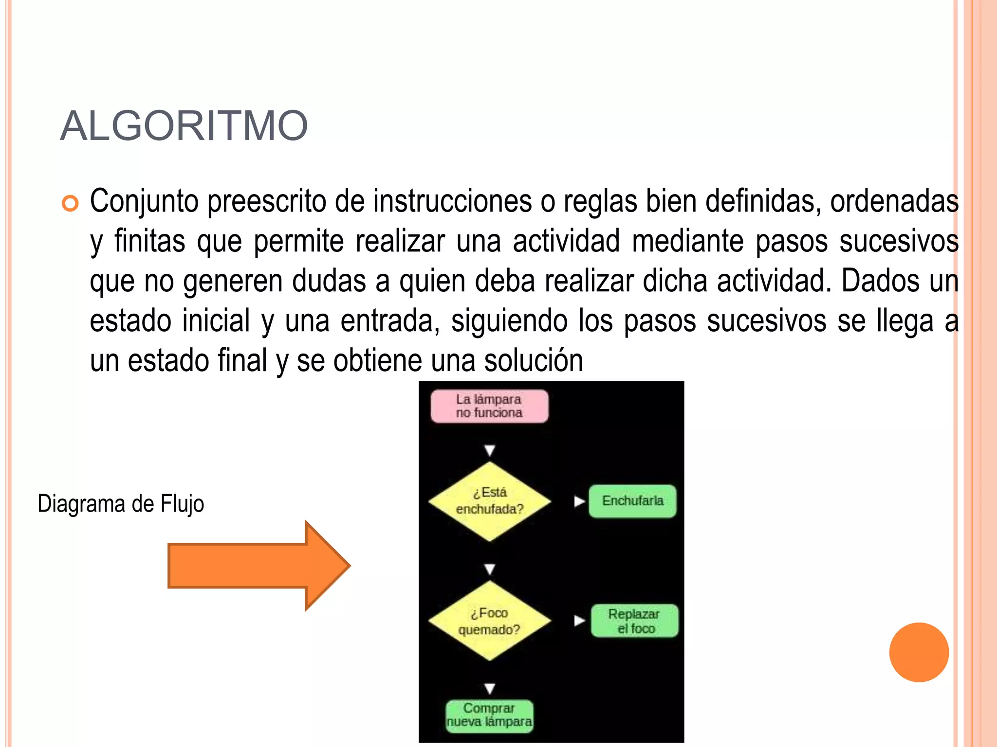 Este documento trata sobre conceptos básicos de algoritmos y programación como algoritmos, diagramas de flujo, pseudocódigo, lenguajes de programación, variables, constantes e instrucciones de lectura y escritura. Explica que un algoritmo es un conjunto de instrucciones bien definidas para resolver un problema, y que pueden expresarse a través de diagramas de flujo, pseudocódigo o lenguajes de programación. También describe los componentes del pseudocódigo como entradas, asignaciones y salidas.