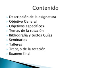La reumatología es el área de la medicina interna que estudia las enfermedades que afectan las articulaciones y tejidos circundantes. El documento provee una breve historia de la especialidad y describe el objetivo del módulo de reumatología, los temas que serán cubiertos, y las actividades y evaluaciones que los estudiantes completarán como parte de la rotación.
