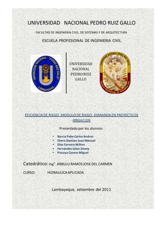 Este documento trata sobre la eficiencia de riego y métodos de riego. Explica conceptos como eficiencia de conducción, eficiencia parcelaria y eficiencia total de un sistema de riego. Describe diferentes métodos como riego por gravedad, aspersión, goteo y sus respectivas eficiencias. Finalmente, proporciona valores típicos de eficiencia para sistemas de riego en la costa peruana.