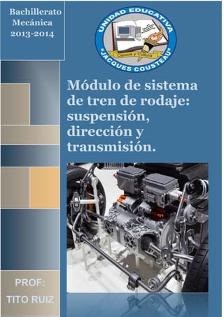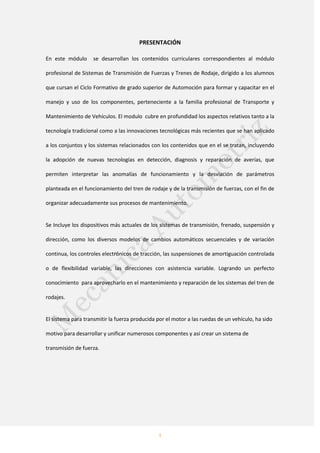 Este documento presenta la primera unidad de un módulo sobre sistemas de transmisión de fuerzas y trenes de rodaje. La unidad introduce conceptos clave sobre las propiedades de los fluidos, incluyendo unidades de medida, peso específico, fuerza y potencia. Explica las leyes fundamentales de los líquidos y su influencia en el comportamiento de los fluidos.