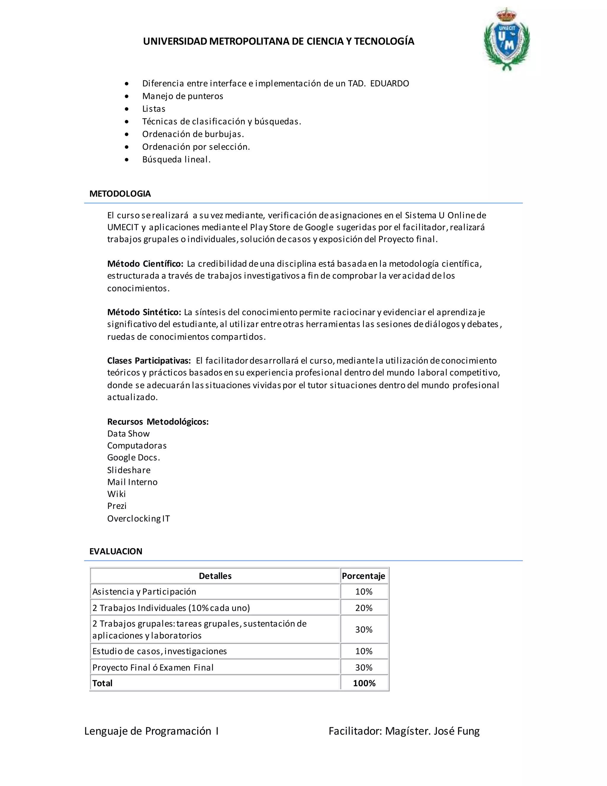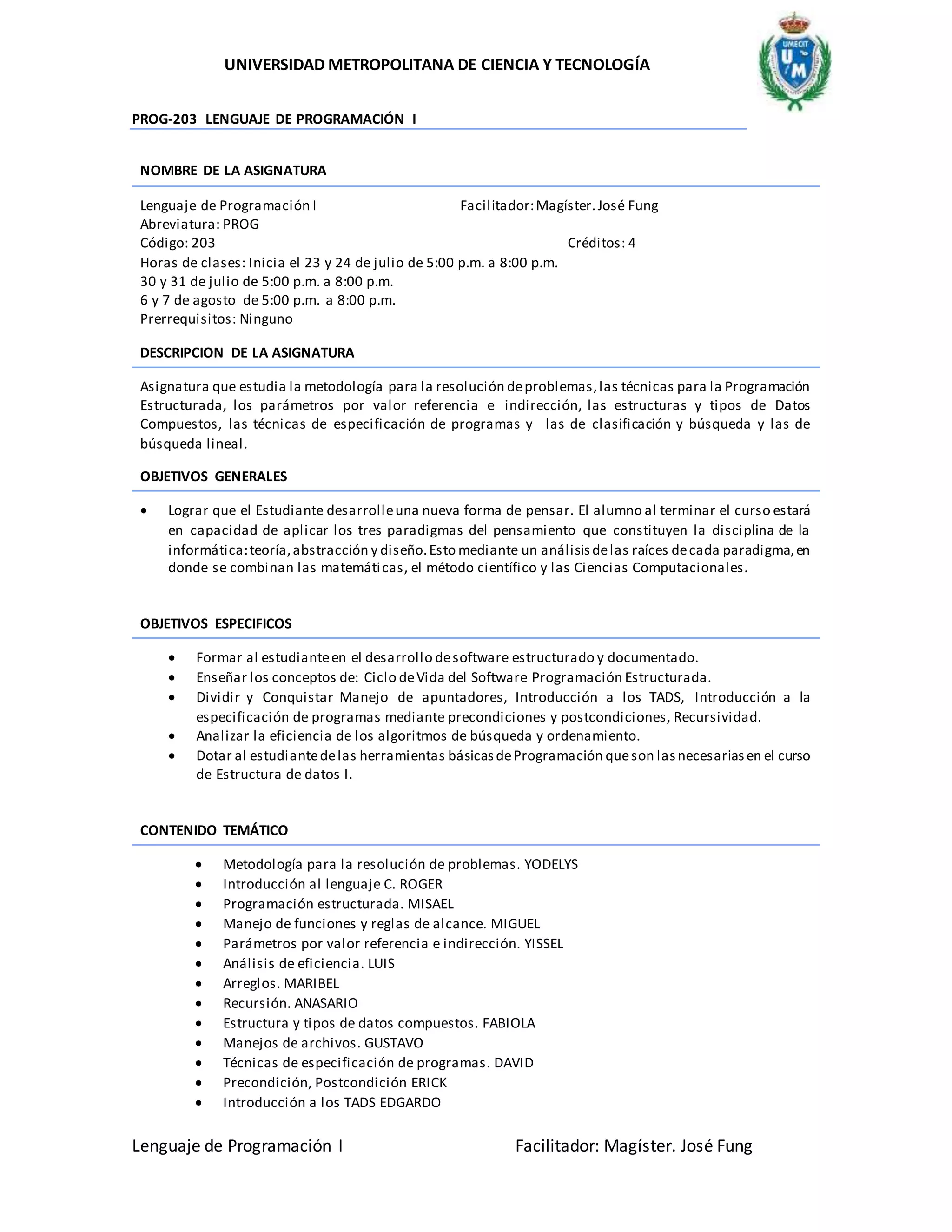 Este documento presenta la descripción del curso de Lenguaje de Programación I impartido por la Universidad Metropolitana de Ciencia y Tecnología. El curso enseña la metodología para la resolución de problemas y técnicas de programación estructurada utilizando el lenguaje C. Los objetivos son desarrollar habilidades de programación y enseñar conceptos como ciclo de vida del software, manejo de funciones, arreglos, recursividad y estructuras de datos. El curso se evalúa a través de asist