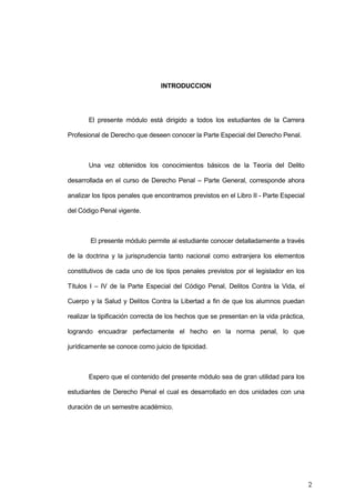 Este documento presenta un módulo sobre la Parte Especial del Derecho Penal. Introduce los delitos contra la vida, el cuerpo y la salud, incluyendo el homicidio, homicidio calificado y el aborto. Explica los bienes jurídicos protegidos, los elementos de los delitos y las penas asociadas. El módulo está dirigido a estudiantes de derecho y cubre dos unidades sobre delitos contra la vida y la libertad a través de lecciones y autoevaluaciones.