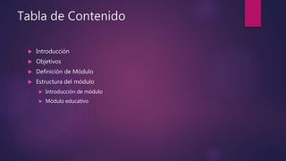 Un módulo educativo es un material didáctico interactivo que contiene todos los elementos necesarios para el aprendizaje de conceptos y destrezas de manera independiente. La estructura básica de un módulo incluye una introducción, el desarrollo del contenido, una actividad práctica, un resumen y una evaluación. El objetivo es presentar la información de manera atractiva y motivante para los estudiantes.