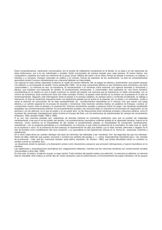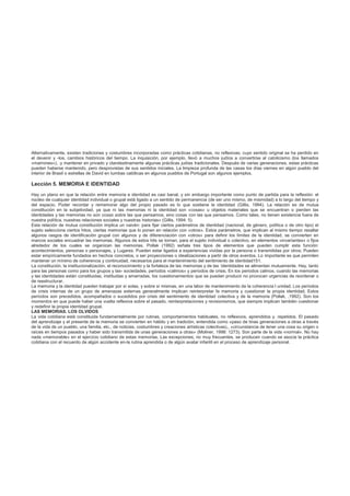 Este documento discute la relación entre memoria e identidad. Explica que la identidad individual o grupal está ligada al sentido de continuidad a través del tiempo, el cual se mantiene a través de los recuerdos del pasado. También describe que la memoria y la identidad se constituyen mutuamente ya que las personas seleccionan ciertos recuerdos que definen sus parámetros de identidad. Finalmente, analiza diferentes tipos de memorias como las habituales no reflexivas y las narrativas que le dan sentido al pasado.