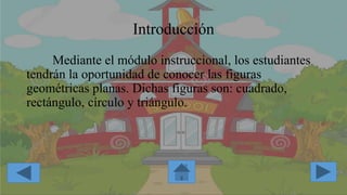Este documento presenta un módulo instruccional sobre las figuras geométricas planas como el cuadrado, rectángulo, círculo y triángulo. El módulo incluye objetivos de aprendizaje, instrucciones, actividades interactivas y evaluaciones para que los estudiantes identifiquen y definan las figuras geométricas.