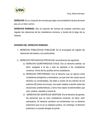 El documento presenta una introducción al derecho romano, explicando que los individuos están sujetos a la ley. Luego describe el derecho romano como el conjunto de principios que rigieron la sociedad romana desde su origen hasta Justiniano. Finalmente, define algunos conceptos clave del derecho romano como justitia y jurisprudentia, y explica las diferentes épocas y fuentes del derecho romano.