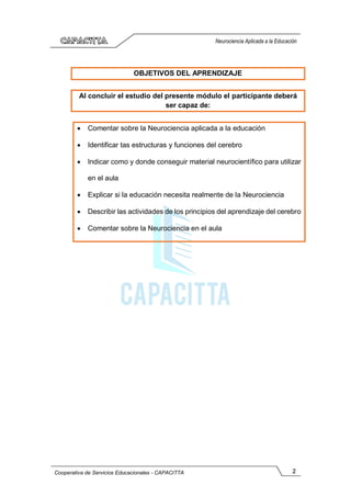Este documento presenta una introducción a la neurociencia aplicada a la educación. Explica conceptos clave como la inteligencia versus la capacidad de aprender, las estructuras y funciones del cerebro, y los mapas mentales. Además, describe cómo la neurociencia puede ayudar a los educadores a comprender mejor el aprendizaje y a diseñar estrategias de enseñanza más efectivas basadas en los principios del aprendizaje cerebral.
