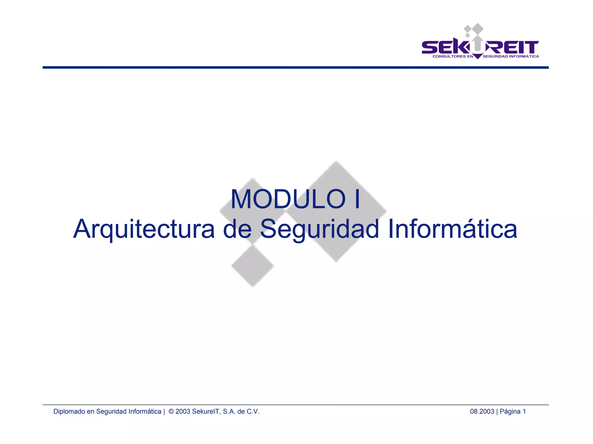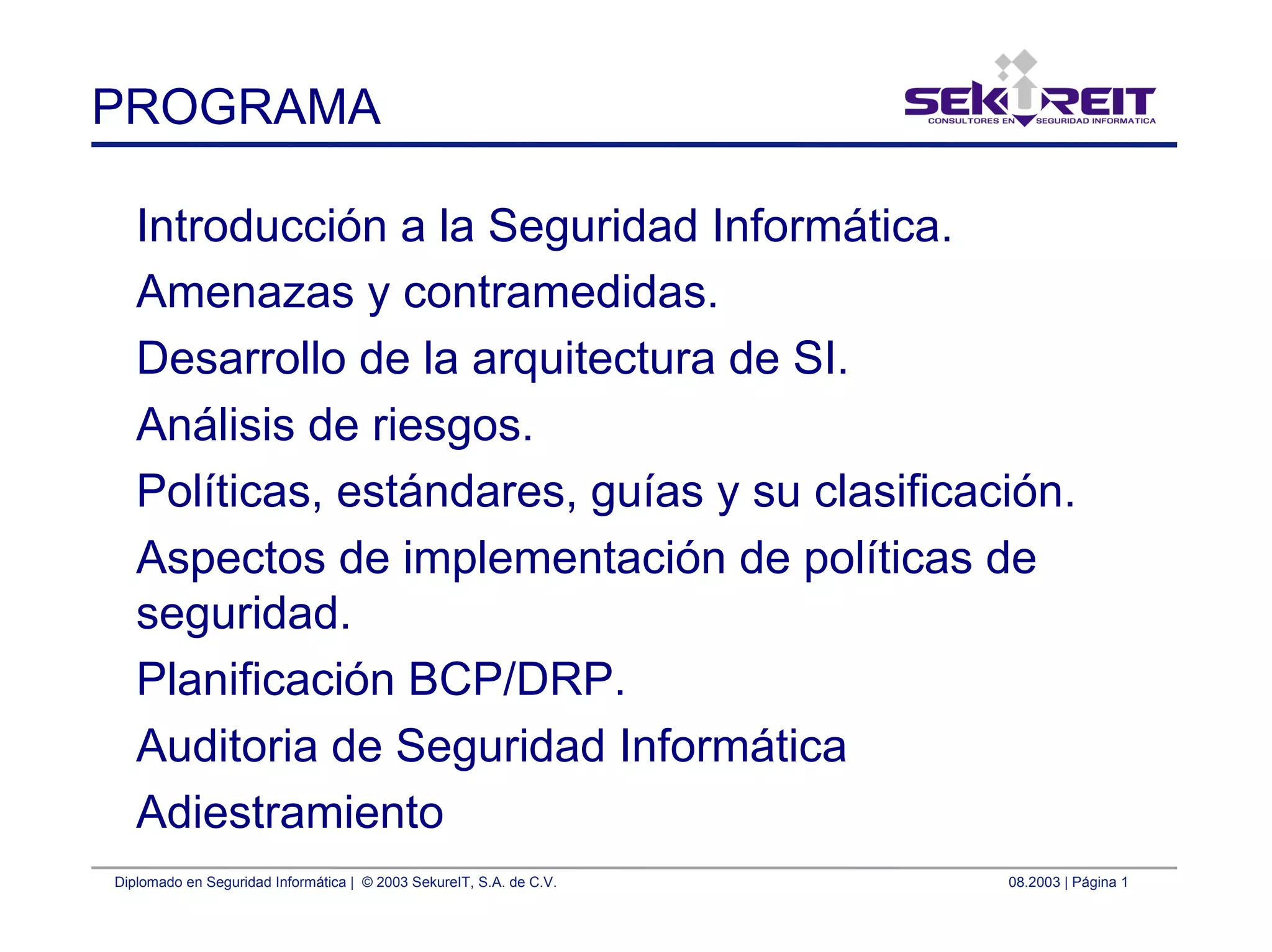 El documento presenta un diplomado en seguridad informática que abarca temas como la arquitectura de seguridad, análisis de riesgos, y la importancia de la confidencialidad, integridad y disponibilidad de la información. Se analizan diferentes tipos de amenazas, incluyendo ambientales, accidentales y deliberadas, y se proponen controles administrativos, físicos y técnicos para mitigar riesgos. La implementación de políticas y procedimientos es crucial para una efectiva estrategia de seguridad informática en las organizaciones.