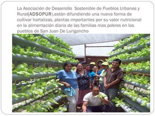 La Asociación de Desarrollo Sostenible de Pueblos Urbanos y Rurales está promoviendo un nuevo método de cultivo hidropónico de hortalizas para familias pobres. Este método permite cultivar plantas sin tierra, aprovechando pequeños espacios y produciendo alimentos sanos. Además, puede generar ingresos y mejorar la nutrición de las familias de manera sostenible.