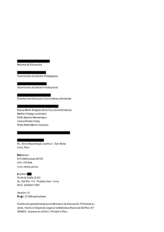 El documento presenta un módulo de educación en gestión del riesgo de desastres para directores y docentes. El módulo contiene una guía para el facilitador con sesiones de aprendizaje, presentaciones y ayudas visuales sobre temas como el enfoque ambiental, la gestión del riesgo de desastres y la elaboración de planes de gestión del riesgo. También incluye una guía para el participante con información sobre el curso, temas de lectura y fichas de evaluación. El objetivo general es fortalecer las capacidades