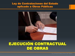 El documento describe los requisitos adicionales para la suscripción de contratos de obras públicas según la Ley de Contrataciones del Estado, incluyendo la presentación de programas de ejecución de obra, calendarios de adquisición de materiales, y análisis de costos. También explica el proceso de inicio del plazo de ejecución, incluyendo la notificación del inspector asignado, entrega del terreno y adelanto directo.