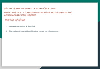 Este documento presenta la unidad didáctica 1.3 sobre el Reglamento Europeo de Protección de Datos y la actualización de la LOPD española. Explica los objetivos específicos de la unidad, su estructura con diferentes secciones, e introduce los principios más relevantes del nuevo reglamento como la responsabilidad, protección de datos por defecto y transparencia. Además, analiza conceptos como el binomio derecho-deber, la licitud del tratamiento, el consentimiento, la lealtad y transparencia y la limitación de la final