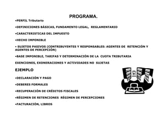 Este documento presenta un programa de capacitación sobre el Impuesto al Valor Agregado (IVA) impartido por el Lcdo. Carlos Alvarado. El programa cubre temas como definiciones básicas, sujetos pasivos, base imponible, tarifas, exenciones, declaración y pago, recuperación de créditos fiscales, facturación y libros contables. El objetivo es capacitar a los participantes para que puedan desempeñarse como asesores tributarios competentes y éticos.