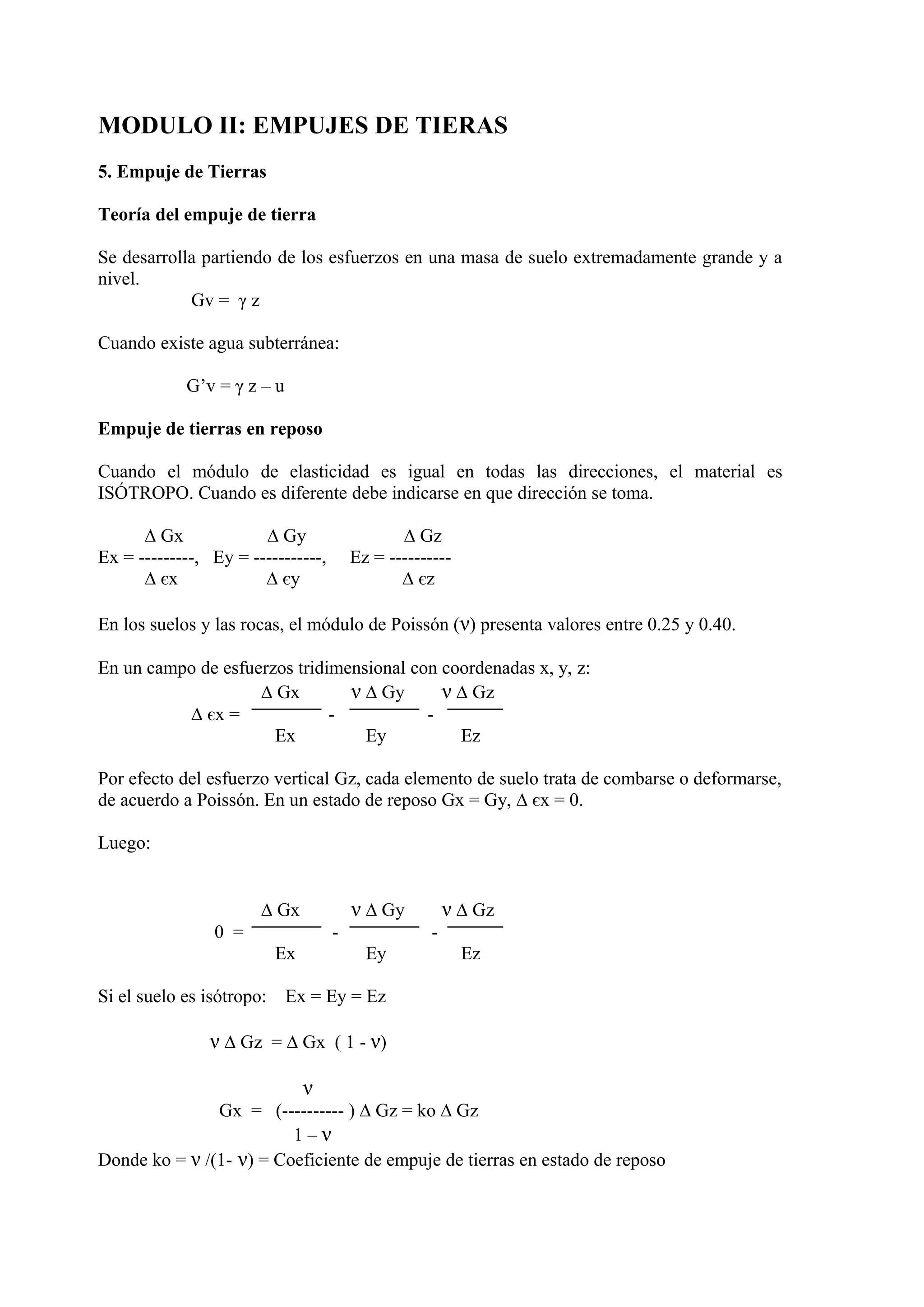 Este documento describe los diferentes tipos de empujes de tierras y los métodos para proyectar muros de sostenimiento. Explica la teoría del empuje de tierras en reposo, activo y pasivo, y cómo calcular los coeficientes de empuje. También cubre los dos tipos principales de muros de sostenimiento - de gravedad y de concreto armado - incluyendo sus dimensiones típicas y cómo distribuir las fuerzas. Además, menciona un tipo alternativo llamado gaviones.