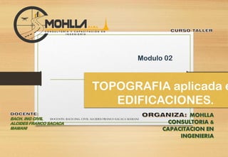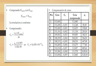 El documento aborda la topografía aplicada a edificaciones, centrándose en la toma de medidas indirectas de distancias mediante instrumentos como niveles y anteojos con retículos. Describe la nivelación como un procedimiento para determinar diferencias de altura entre puntos en el terreno y detalla métodos de nivelación geométrica, trigonométrica y barométrica, así como recomendaciones para su correcta ejecución. Además, incluye ejemplos de cálculo y compensación de errores en nivelaciones, enfatizando su precisión en proyectos de construcción.