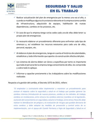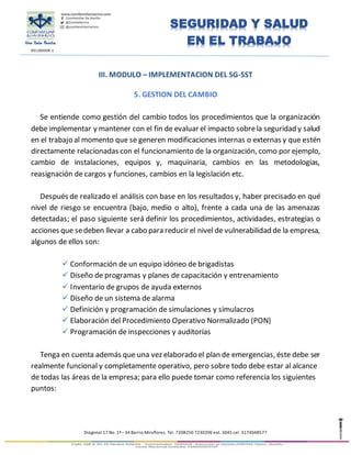 El documento habla sobre la gestión del cambio en el lugar de trabajo. Explica que la gestión del cambio implica evaluar el impacto en la seguridad y salud laboral cuando ocurren cambios internos o externos en la organización, como cambios en instalaciones, equipos, metodologías o legislación. También detalla algunas acciones para reducir la vulnerabilidad ante amenazas detectadas, como conformar brigadas, capacitar trabajadores y actualizar planes de emergencia. Finalmente, cita un decreto colombiano que requiere que los empleadores evalúen