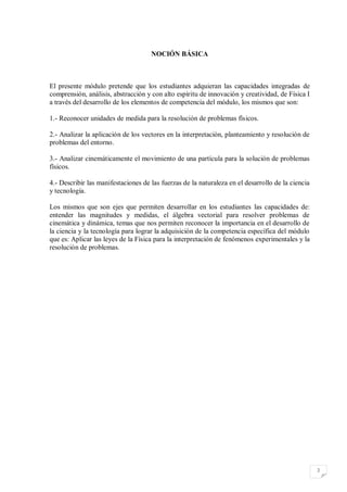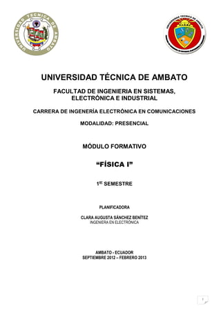 Este documento presenta el módulo formativo "Física I" impartido en la carrera de Ingeniería Electrónica en Comunicaciones de la Universidad Técnica de Ambato. El módulo se enfoca en desarrollar cuatro elementos de competencia en los estudiantes: reconocer unidades de medida, analizar vectores, analizar movimiento de partículas, y describir fuerzas de la naturaleza. El documento incluye detalles sobre objetivos, contenidos, metodología, evaluación y material de apoyo para el módu