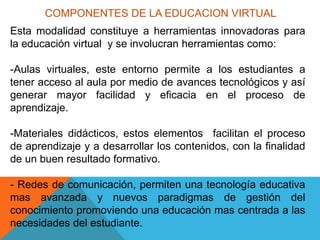 Este documento describe los componentes y ventajas de la educación virtual. Explica que la modalidad virtual involucra herramientas como aulas virtuales, materiales didácticos y redes de comunicación que facilitan el aprendizaje. También destaca que la formación virtual permite el uso de herramientas tecnológicas, genera mayor interacción y flexibilidad para los estudiantes. Además, describe las funciones y competencias requeridas de los estudiantes virtuales así como las razones para integrar las tecnologías de la información y la comunicación en el