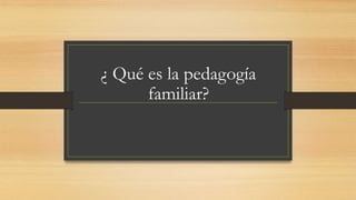 Este documento resume la pedagogía familiar como la ciencia que estudia los procesos educativos en el seno de la familia. Explora las tareas de la pedagogía familiar como crítica, empírica y de acción. También describe las funciones de la familia como agente de socialización y desarrollo personal, así como los factores de protección y riesgo a nivel familiar. Finalmente, discute los retos actuales de las nuevas estructuras familiares como consecuencia de cambios sociales.