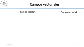 Este documento presenta conceptos básicos de cálculo vectorial como campos vectoriales, gradiente, divergencia, rotacional, campos conservativos e integrales de línea. Incluye definiciones, fórmulas y ejemplos para calcular cada uno de estos conceptos.