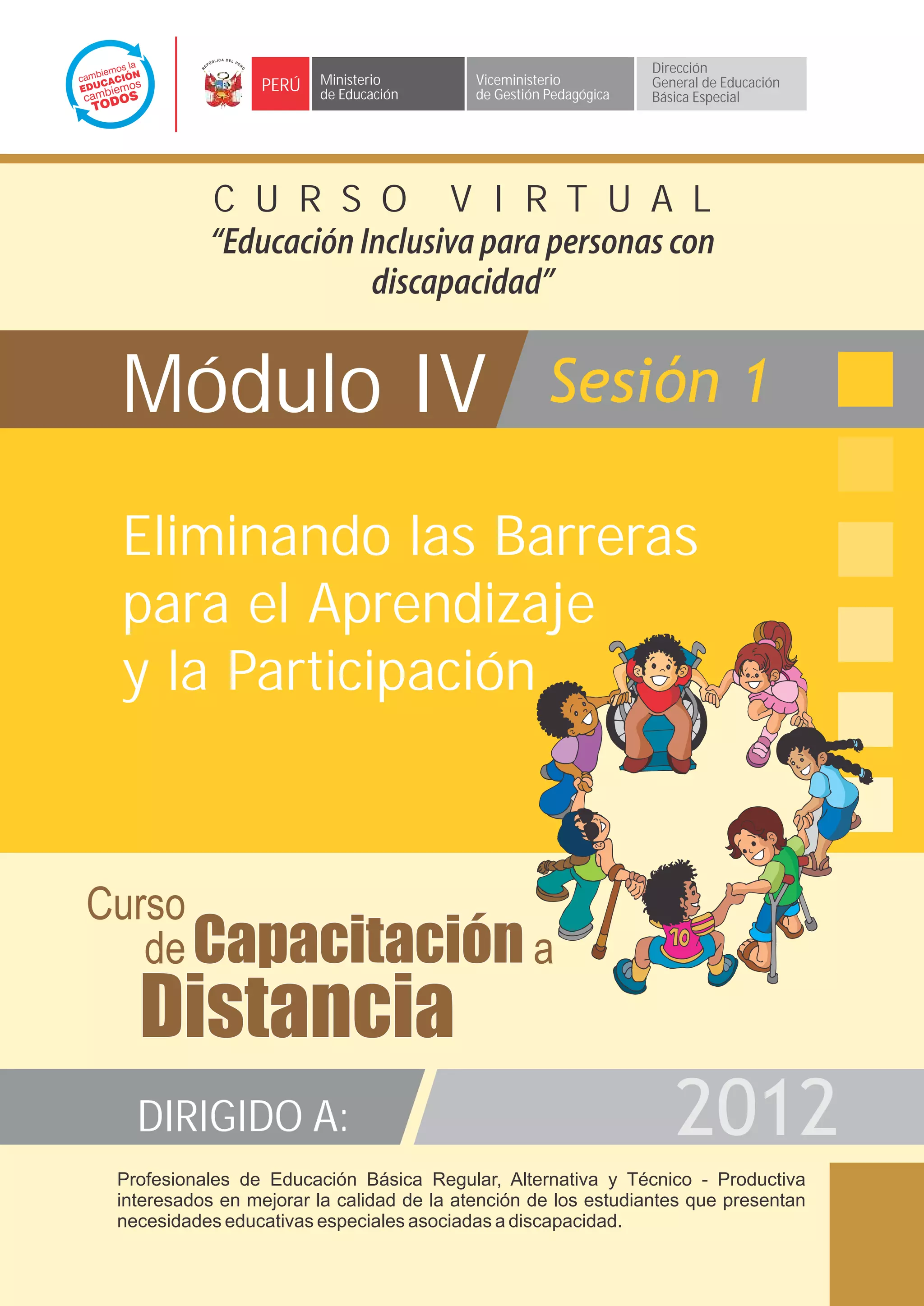 Este documento presenta el primer módulo de un curso virtual sobre educación inclusiva en Perú. El módulo se titula "Eliminando las barreras para el aprendizaje y la participación" y consta de tres sesiones que cubren el sistema educativo peruano, adaptaciones curriculares y el proceso de diversificación. La primera sesión introduce el tema del sistema educativo peruano y explica que se basa en los principios de calidad, equidad e inclusión para garantizar el derecho a la educación de todos los peruanos.