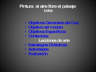 Este documento presenta el módulo IV de una licenciatura en artes plásticas sobre pintura al aire libre de paisajes al óleo. Los objetivos son desarrollar conocimientos sobre técnicas óleo y pintar un paisaje del natural aplicando la técnica húmedo sobre seco. Los contenidos incluyen pintura al aire libre, elementos del paisaje y creación de atmósfera. Las estrategias didácticas son ejercicios prácticos y explicaciones del profesor, y la evaluación consiste en ej