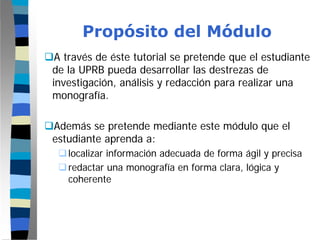 Este módulo instruccional explica cómo preparar una monografía. Se define una monografía como un estudio profundo de un tema particular que produce un trabajo escrito sustentado por documentación extensa. El módulo guía a los estudiantes a través del proceso de definir un tema, identificar requisitos de información, buscar y acceder información relevante, y organizar los hallazgos para la redacción de la monografía. El objetivo es desarrollar las habilidades de investigación, análisis y redacción de los estudiant