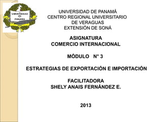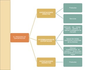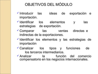 Este documento presenta información sobre estrategias de exportación e importación. Introduce los conceptos básicos de exportar e importar y analiza los factores ambientales que influyen en estas operaciones. Luego describe las estrategias de exportación e importación, incluyendo los pasos para diseñar una estrategia de exportación y los tipos de intermediarios involucrados en los procesos de exportación e importación. Finalmente, analiza el comercio compensatorio y sus dos tipos básicos.