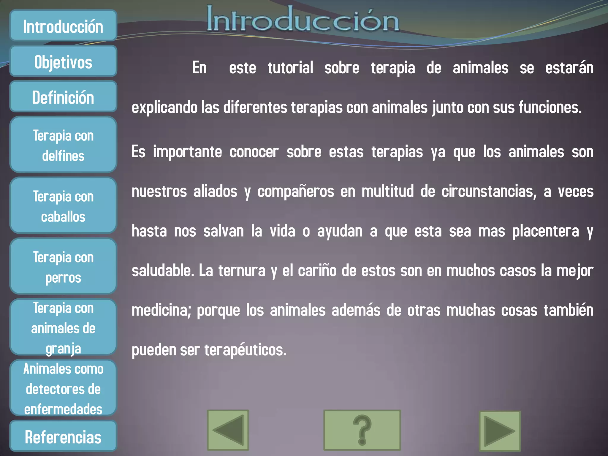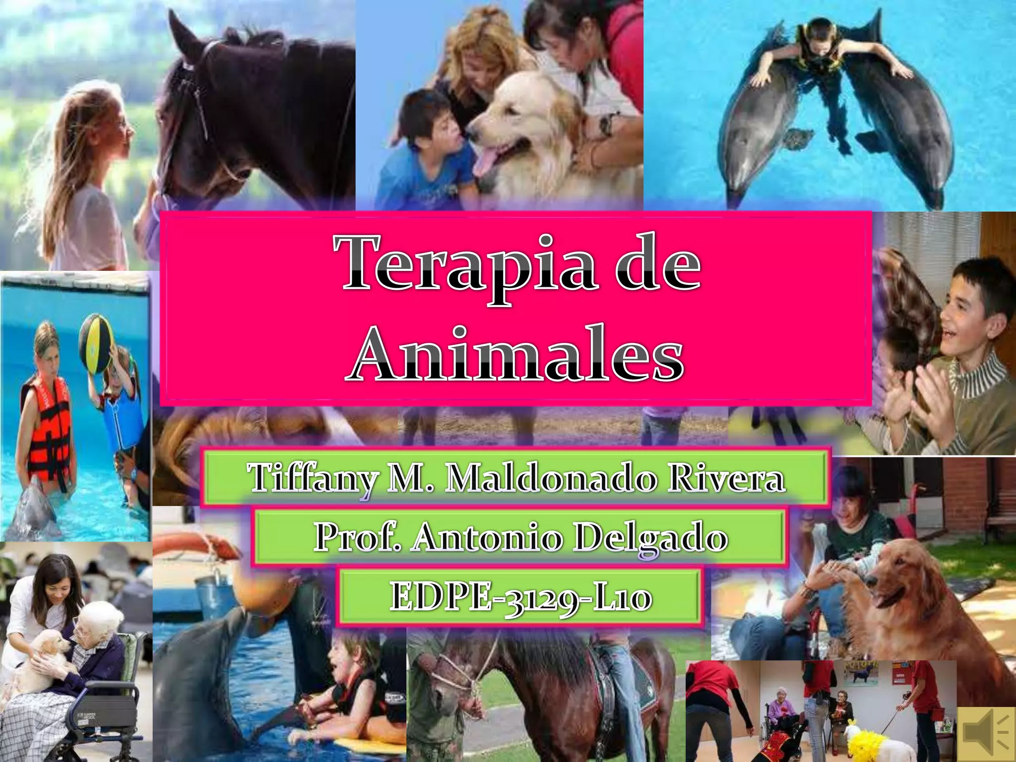 El documento resume diferentes terapias asistidas con animales como la delfinoterapia, equinoterapia, terapia con perros y animales de granja. Explica los beneficios de cada terapia y cómo ayudan a tratar diversas condiciones. También menciona el potencial de los perros para detectar enfermedades como convulsiones y cáncer.