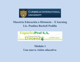 Este documento presenta el Módulo 1 de una maestría en educación a distancia sobre e-learning. El módulo se enfoca en una nueva visión educativa y contiene 5 unidades que cubren temas como la influencia de la tecnología en el desarrollo humano, la importancia de la tecnología en la educación, y herramientas básicas de Internet. El objetivo es capacitar a docentes para incluir las TIC en sus prácticas educativas y adaptarse a una generación digital de estudiantes.