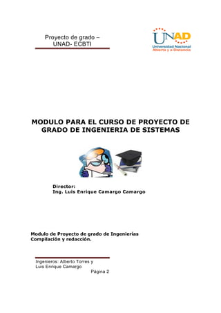 Este documento presenta un módulo para el curso de proyecto de grado de ingeniería en la Universidad Nacional Abierta y a Distancia (UNAD). El módulo contiene información sobre la normatividad de la UNAD, las alternativas de proyecto de grado, técnicas de investigación, metodologías de investigación y comunicación de resultados. El objetivo general es capacitar a los estudiantes en los procesos de investigación para resolver problemas en el área de ingeniería. El módulo está organizado en tres unidades que cubren aspectos norm