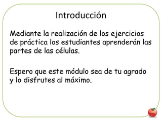 Este documento presenta un módulo educativo sobre las partes de la célula. El módulo incluye objetivos de aprendizaje, instrucciones, una pre-prueba y post-prueba con preguntas sobre las partes de la célula, y material complementario y referencias. El objetivo es que los estudiantes identifiquen, clasifiquen y definan correctamente las partes de la célula después de completar las actividades.