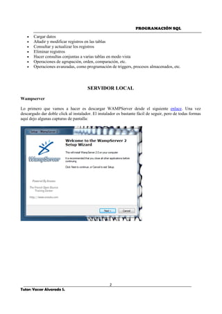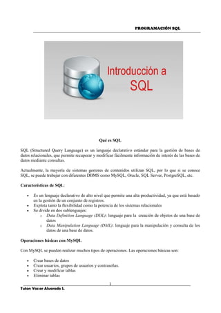 SQL es un lenguaje estándar para gestionar bases de datos relacionales que permite recuperar y modificar información mediante consultas. Se divide en DDL para crear objetos y DML para manipular datos. MySQL permite crear bases de datos y tablas, cargar y consultar datos. Los tipos de datos incluyen números, fechas, cadenas y blobs para almacenar archivos.