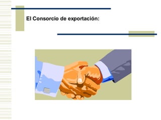 El documento habla sobre la formación de consorcios de exportación entre empresas. Explica que un consorcio es una alianza estratégica basada en la confianza mutua que permite a las empresas unir fuerzas para conquistar nuevos mercados, crecer de forma sostenible y aumentar la rentabilidad mediante la cooperación y el aprovechamiento de sinergias. También destaca la importancia de contar con una estrategia y criterios de gestión comunes, así como una infraestructura que soporte la colaboración a largo plazo entre las empresas asoci