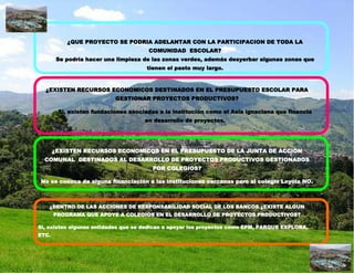 El documento describe la ubicación de un colegio en Medellín, Antioquia, en un sector dedicado a la actividad comercial. Se sugiere que un proyecto que podría adelantarse es sobre prevención de salud respiratoria debido a la contaminación vehicular en el área. También se podría hacer una limpieza de las zonas verdes del colegio con la participación de toda la comunidad escolar. Existen recursos económicos de fundaciones asociadas para financiar proyectos productivos.