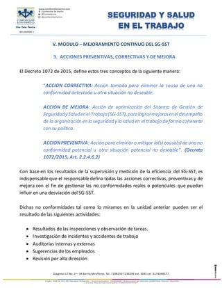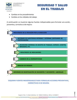 El documento define acciones preventivas, correctivas y de mejora como acciones tomadas para eliminar causas de no conformidades detectadas, optimizar el sistema de gestión de seguridad y salud en el trabajo, y eliminar o mitigar causas de posibles no conformidades. Explica que estas acciones se basan en resultados de supervisión, auditorías, incidentes y sugerencias, y que es importante revisarlas y comunicar los resultados.