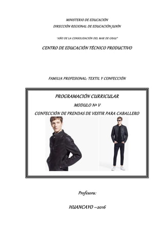 Este documento presenta la programación curricular de un módulo de confección de prendas de vestir para caballero en un centro de educación técnico productivo. El módulo dura 288 horas y se enfoca en capacitar a los estudiantes en la organización de un taller de confecciones, confección de pantalones y casacas para caballero siguiendo normas de calidad, y gestión empresarial. El módulo consta de cinco unidades didácticas y capacidades terminales evaluadas, así como contenidos, valores, estrategias de ense