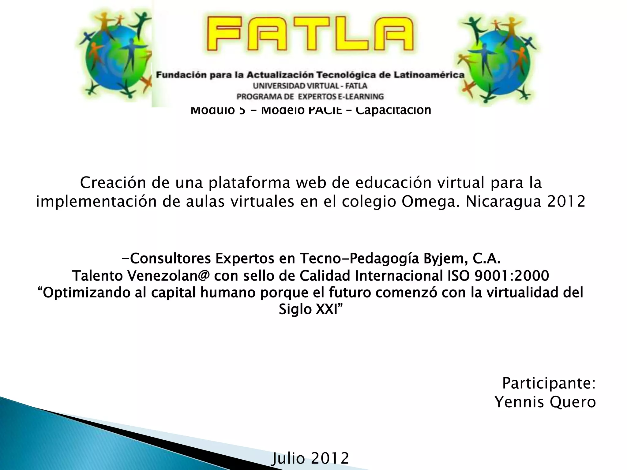 El documento describe la necesidad de implementar una plataforma de educación virtual en el colegio Omega en Nicaragua para mejorar el uso de las TIC en la enseñanza. Actualmente, el colegio no tiene una plataforma y el 40% de los profesores no tienen habilidades informáticas a pesar de que el 20% tiene computadoras e internet en casa. Se propone diseñar un plan para inducir a directivos, profesores y estudiantes sobre el uso de las TIC y aulas virtuales, y preparar a profesores y estudiantes para usar las TIC como