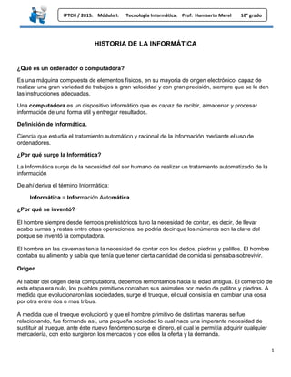 Este documento resume la historia de la informática, desde los primeros métodos de cálculo manual usados por el hombre primitivo como los dedos y las piedras, hasta el desarrollo de las primeras máquinas mecánicas y electrónicas como el ábaco, la máquina diferencial y los primeros ordenadores de las primeras generaciones. Explica también las cinco generaciones de ordenadores y cómo han evolucionado gracias a avances tecnológicos como el transistor, el chip y el microprocesador, llevando al desarrollo de los ordenadores