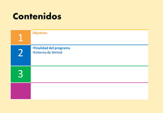 Este documento presenta un taller de capacitación virtual sobre el uso de la herramienta Xmind. El taller tiene como objetivos fortalecer el uso de recursos tecnológicos en los docentes y conocer la finalidad y el entorno de Xmind. Se explican conceptos como objetivos generales y específicos, la instalación de Xmind, su finalidad, el entorno con barras y paneles, y cómo crear y dar formato a organizadores visuales mediante la escritura, jerarquización, color y forma de elementos e inserción de imágenes.