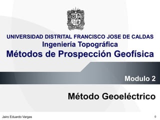 Este documento presenta información sobre el método geoeléctrico para la prospección geofísica. Explica conceptos clave como resistividad, corriente eléctrica, voltaje y la ley de Ohm. También describe los métodos de Wenner y Schlumberger para medir la resistividad del suelo, que es útil para inferir la composición del subsuelo. El objetivo es definir las bases teóricas del método geoeléctrico y realizar un ejemplo práctico de un sondeo eléctrico vertical.