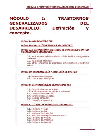 Este documento presenta una introducción a los trastornos generalizados del desarrollo, incluyendo una breve historia del concepto de autismo y cómo ha evolucionado, así como una descripción general de las unidades que componen el módulo sobre este tema. El módulo cubre la definición, diagnóstico, epidemiología, etiología, características clínicas y otros trastornos del desarrollo.