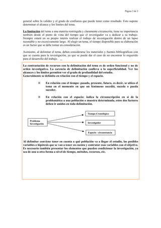 El documento habla sobre las limitaciones y delimitaciones en una investigación. Explica que las limitaciones son factores externos como falta de tiempo o recursos, mientras que las delimitaciones son los parámetros elegidos por el investigador para definir el alcance del estudio, como el tema, población, variables e hipótesis. También señala que delimitar adecuadamente el tema es crucial para el éxito de un proyecto de investigación y que involucra factores como el tiempo disponible, los materiales de referencia y el tipo de estudio a realizar.