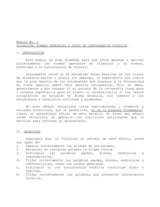 Este documento presenta un módulo sobre tildación y normas de acentuación del español. Explica conceptos básicos como sílaba, acento, tilde y clasifica las palabras en agudas, graves, esdrújulas y sobresdrújulas. Incluye ejercicios para identificar la sílaba tónica, separar palabras en sílabas y aplicar correctamente las reglas de tildación. El objetivo es que los estudiantes dominen estas normas ortográficas a través de la práctica continua.
