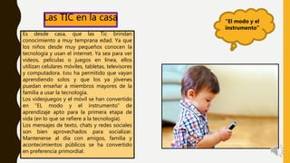 El documento describe cómo la tecnología se ha integrado en la educación y el trabajo. Ahora los niños aprenden temprano usando dispositivos tecnológicos, y la enseñanza y el aprendizaje se pueden realizar de forma remota. En el trabajo, la tecnología ha hecho que las tareas sean más fáciles y ha permitido nuevas formas de realizar el trabajo de manera remota. Esto ha beneficiado tanto a las empresas como a los trabajadores.