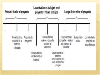 El documento discute la importancia de la evaluación formativa y sumativa. Sugiere que los estudiantes deben recibir información continua sobre su progreso y metas de aprendizaje, y deben participar en el proceso de autoevaluación y evaluación de sus compañeros. También enfatiza la necesidad de utilizar una variedad de estrategias de evaluación y de involucrar a los estudiantes a lo largo del ciclo de aprendizaje.