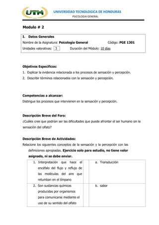 Este documento presenta información sobre la asignatura de Psicología General en la Universidad Tecnológica de Honduras. Cubre temas como la sensación, la percepción, los diferentes sentidos como la visión, audición, olfato y otros. Explica conceptos como transducción, constancia perceptual, claves monoculares y binoculares para la percepción de profundidad.
