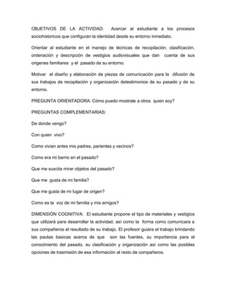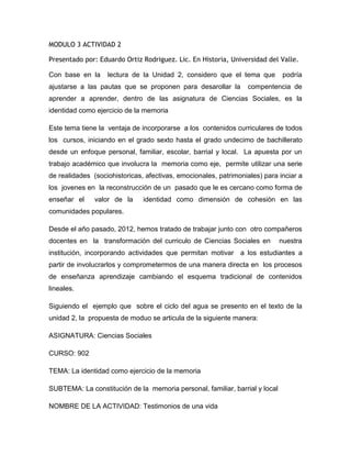 Este documento presenta una propuesta de actividad para el curso 902 de Ciencias Sociales sobre la identidad como ejercicio de la memoria. La actividad involucra a los estudiantes en recopilar testimonios sobre la historia de su familia y barrio a través de entrevistas y materiales como fotografías y videos. Luego, los estudiantes organizan esta información y la comparten con sus compañeros utilizando una herramienta virtual. Finalmente, se forman grupos para crear videos cortos explicando la importancia de la identidad y la memoria.