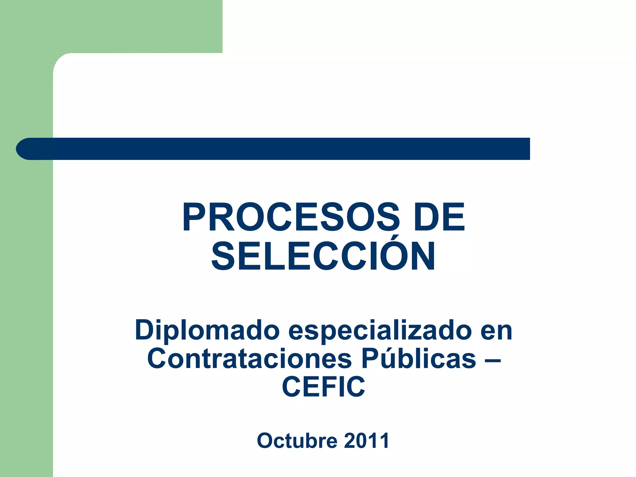 El documento describe los diferentes procesos de selección para contrataciones públicas en Perú, incluyendo licitaciones públicas, concursos públicos, adjudicaciones directas y de menor cuantía. Explica las etapas de cada proceso como convocatoria, registro de participantes, consultas, integración de bases, presentación y evaluación de propuestas. También detalla los montos y plazos aplicables a cada tipo de proceso de selección.