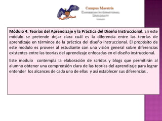 El documento presenta un módulo de capacitación sobre teorías del aprendizaje y su aplicación en el diseño instruccional, diferenciando teorías como el conductivismo, cognitivismo, constructivismo, ecléctico y cambio conceptual. Se detallan objetivos académicos, actividades, y estrategias de evaluación, así como recursos y metodologías en línea y presenciales para facilitar el aprendizaje colaborativo. Además, se promueve la elaboración de ensayos y debates para fortalecer la comprensión de estas teorías.